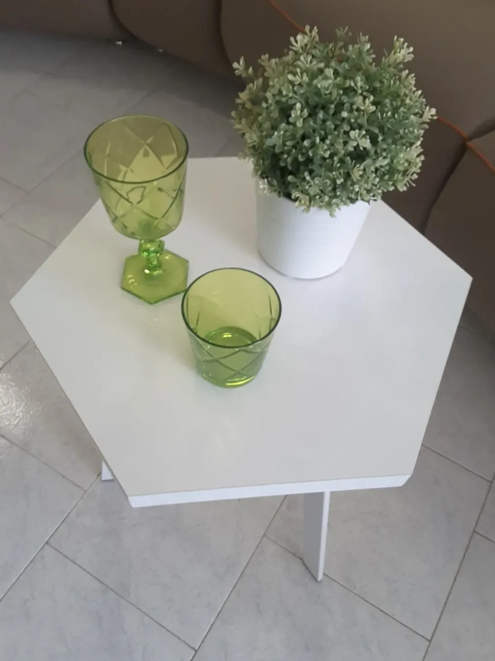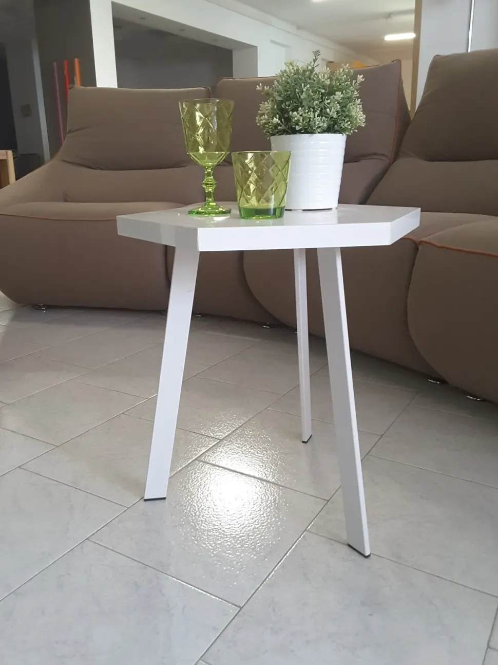 Tavolino con piano esagonale bianco lucido e gambe bianco opaco dimensione 43,5 x 51,5 H