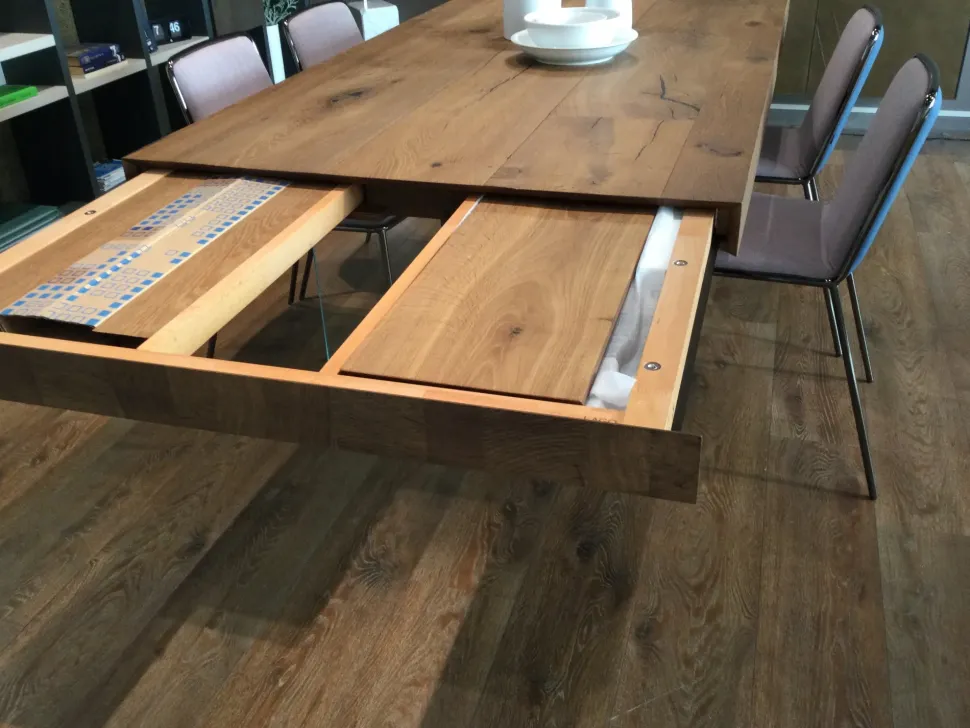 Tavolo rettangolare allungabile in massello di rovere naturale con basamento in cristallo trasparente extrachiaro L.190×100 allungabile a 294