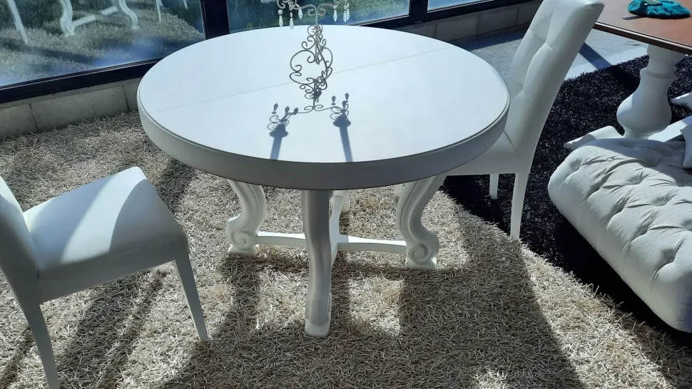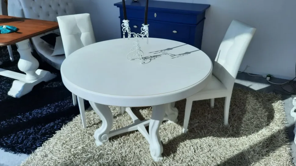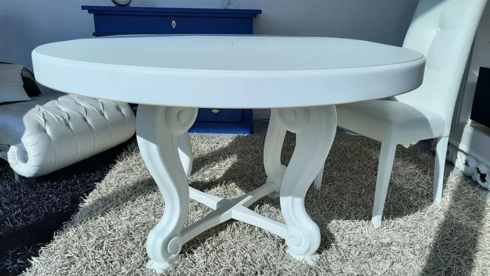 Tavolo Artigianale Allungabile modello Eraclea in legno massiccio con gambone intagliato a mano , colore bianco opaco con bordi leggermente consumati , disponibile anche in colore personalizzato , adatto per qualsiasi ambiente , misure diametro 120(+1 allunga da 40 cm) x78H