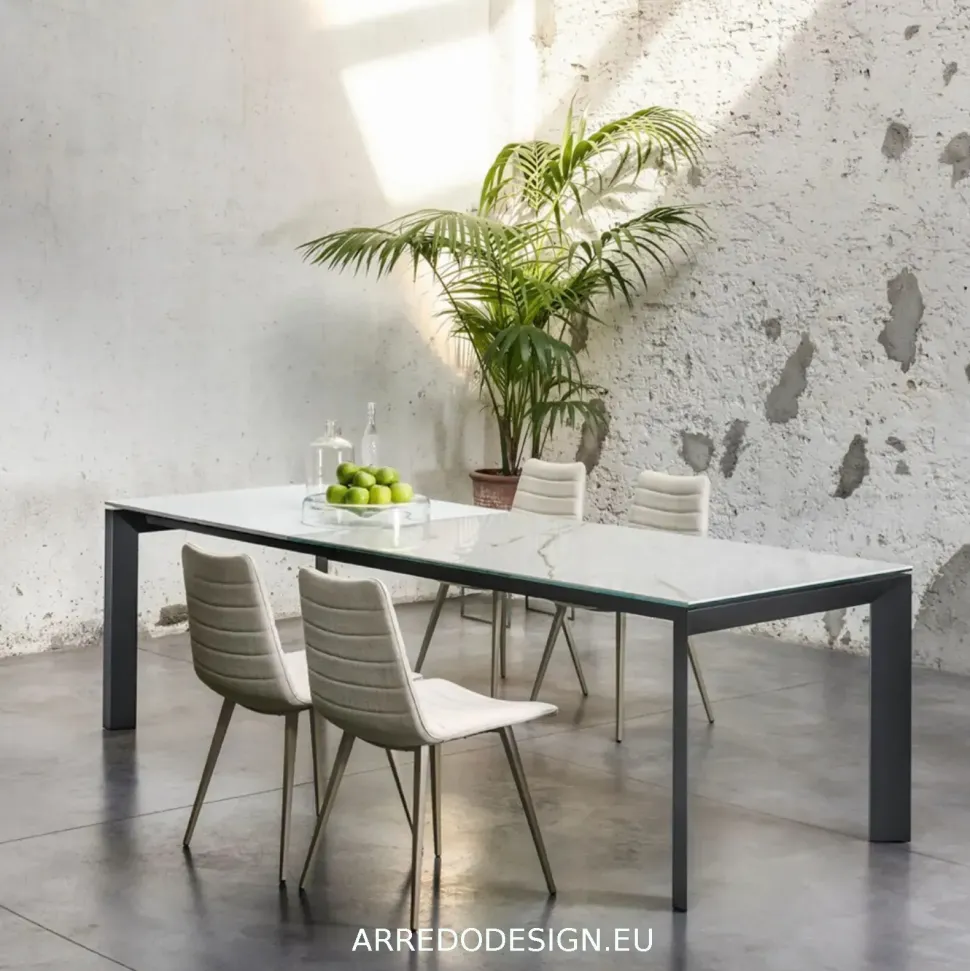 Questo tavolo Apollo è caratterizzato da una struttura a quattro gambe che ne integra il valore estetico, interamente realizzato con materiali pregiati e resistenti negli anni.