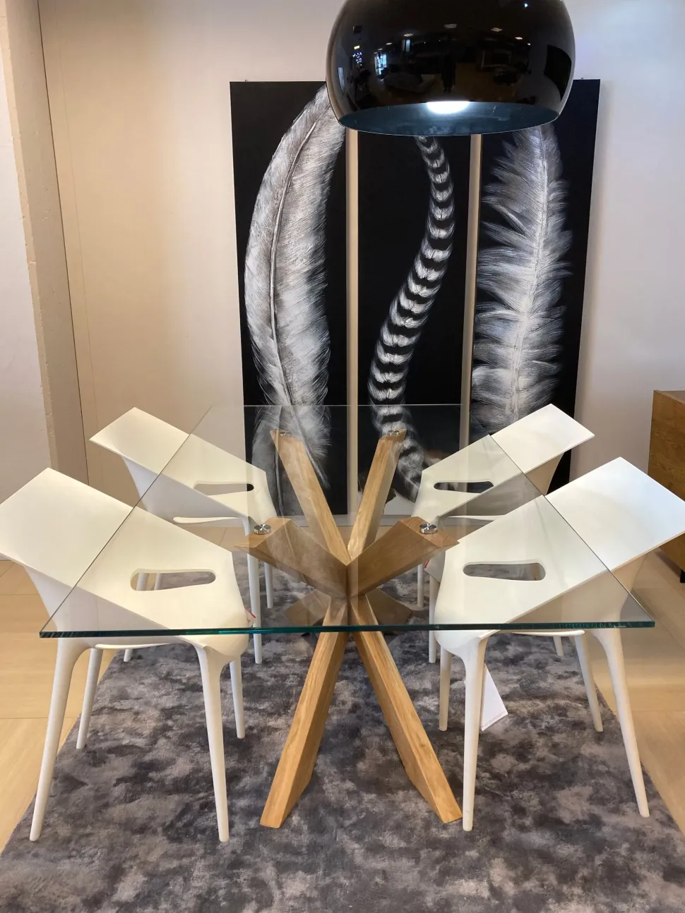 STUPENDO TAVOLO ARTIGIANALE CON PIANO IN VETRO TEMPERATO TRASPARENTE EXTRA CHIARO E BASAMENTO CON GAMBE INCROCIATE LEGNO DI ROVERE. misure L. 200 X105