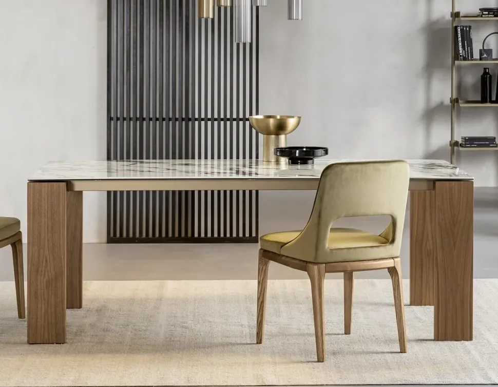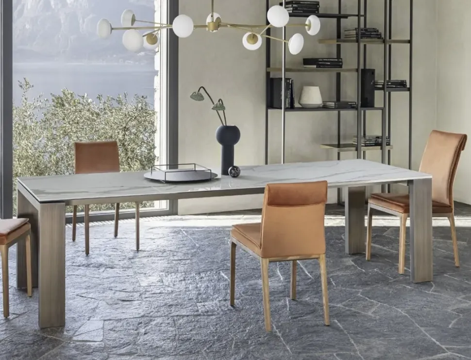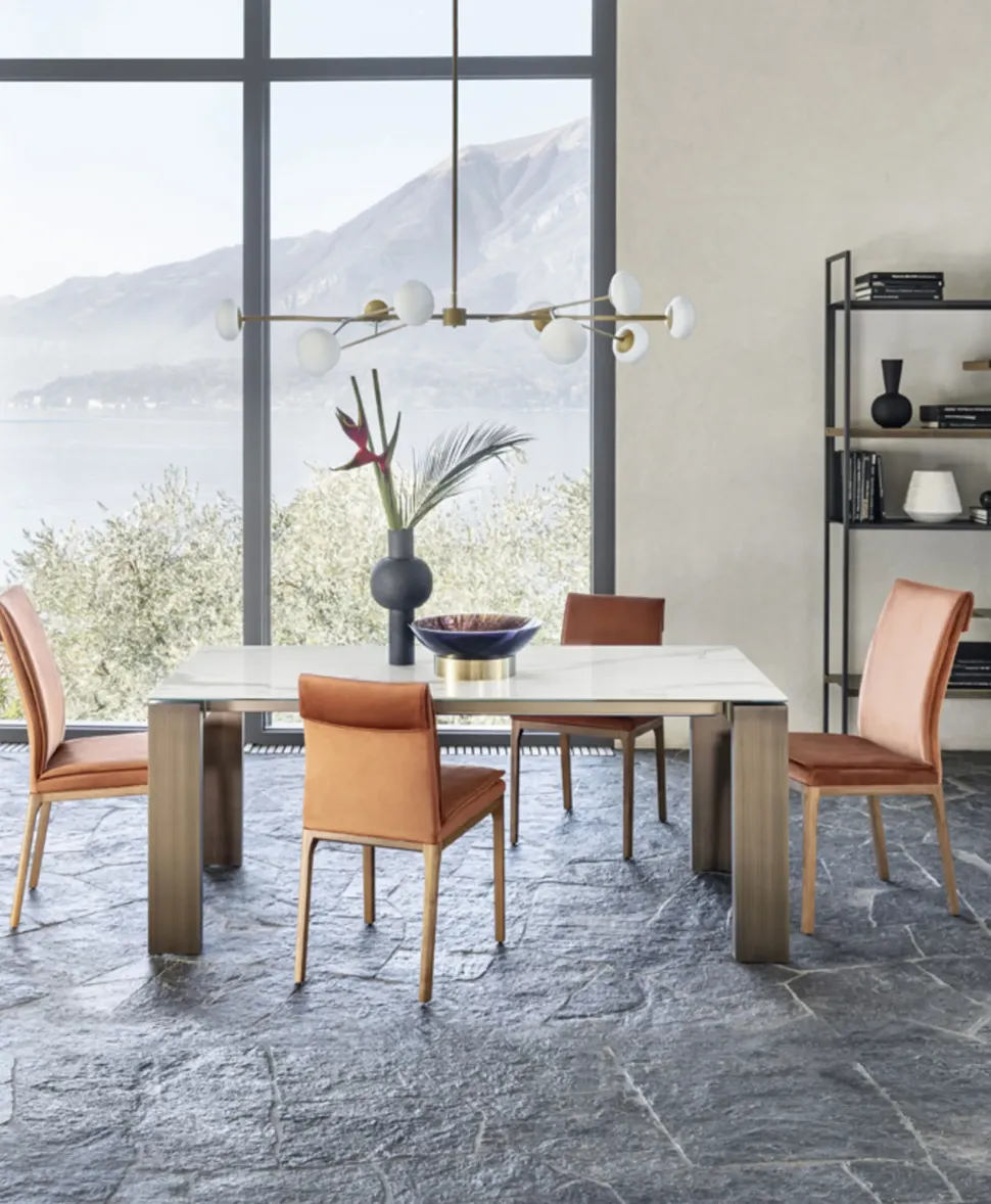 È dotato di un sistema di estensione composto da una allunga unica a libro realizzata in ceramica in continuità con il piano. Come per tutti gli elementi delle collezioni Riflessi, è possibile personalizzare con numerose finiture sia le gambe, sia il piano in ceramica