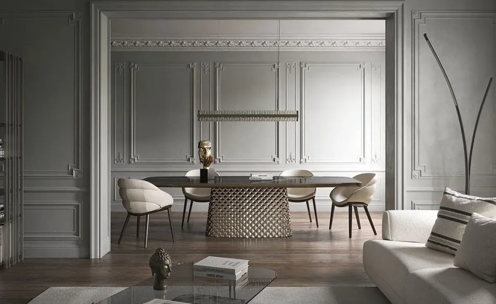 La famiglia di tavoli Atrium conta numerose versioni, per soddisfare le più svariate esigenze estetiche e arredare al meglio una sala da pranzo moderna. La base centrale è formata da due lastre di cristallo specchiato couture, finemente lavorate. Il tavolo crea un gioco di riflessioni soffuse, in cui riverberano gli oggetti e le fonti di luce circostanti. Il cristallo è modellato con una tecnica senza precedenti, che permette di dare alla superficie un effetto tridimensionale, come una trapuntatura su tessuto. I piani dei tavoli della linea Atrium spaziano dal legno, alla ceramica