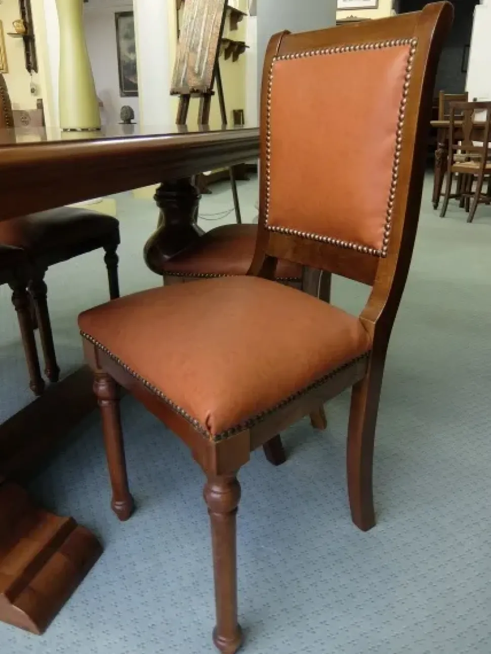 – 4 sedie con sedile e schienali imbottiti e rivestiti in pelle, con vera chiodatura nei bordi