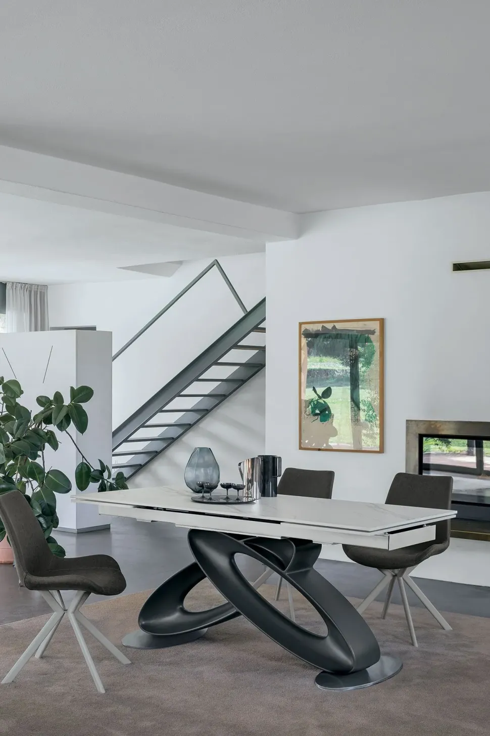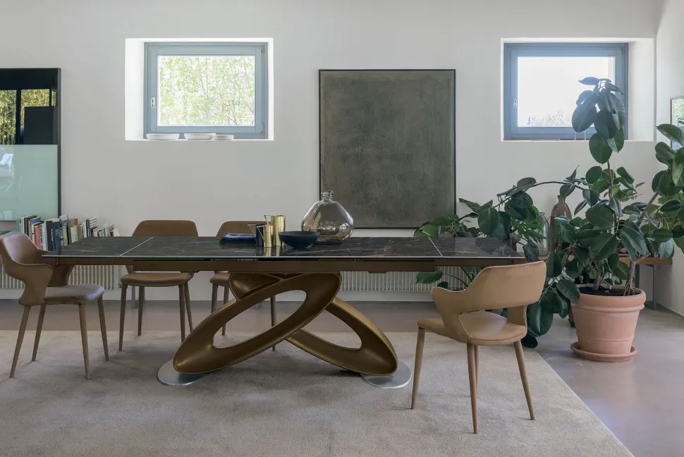 Tavolo allungabile con basamento in poliuretano.