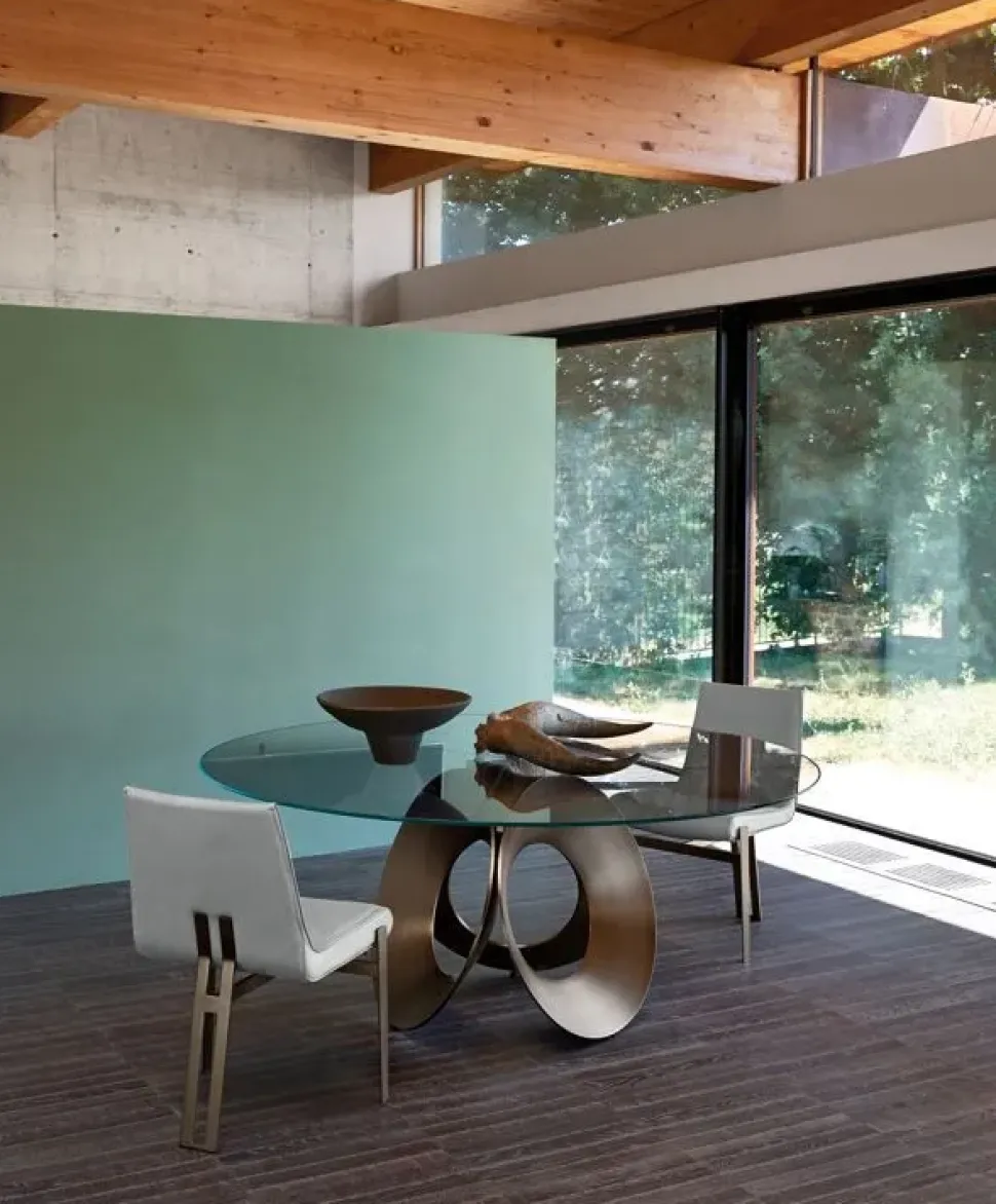 La base è un prodotto complesso: tre cerchi metallici che si incontrano in punti diversi dimostrando che l’eleganza può essere arte e che il lusso può oltrepassare i confini, disponibile in marrone micaceo, ottone, titanio ed oxy grey. Il piano può essere di forma circolare oppure ovale ed è disponibile in rovere moka o in sucupira e marmo Emperador o Niveo White con il vassoio rotante Lazy Susan, che si integra perfettamente nel tavolo. L’unico modo in cui il design originale di Oracle poteva essere migliorato per esaltarne leggerezza, equilibrio ed armonia era quello di evidenziare ciò che lo rende unico: la struttura della base. Quest’ultima è diventata visibile per mezzo di un elemento invisibile: il vetro.