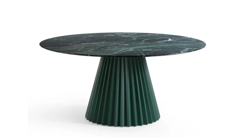 Tavolo Plissè con basamento centrale in metallo verniciato. Piano rotondo in legno impiallaciato, cristalceramica o marmo (versione ø180 non disponibile in cristalceramica). Optional: vassoio lazy susan girevole ø60cm – 23,6 in.