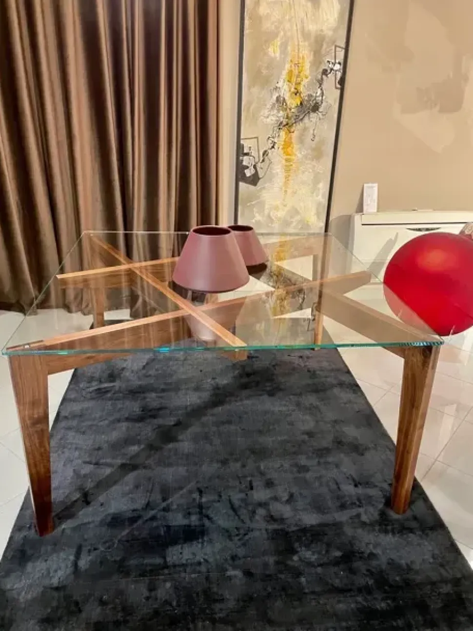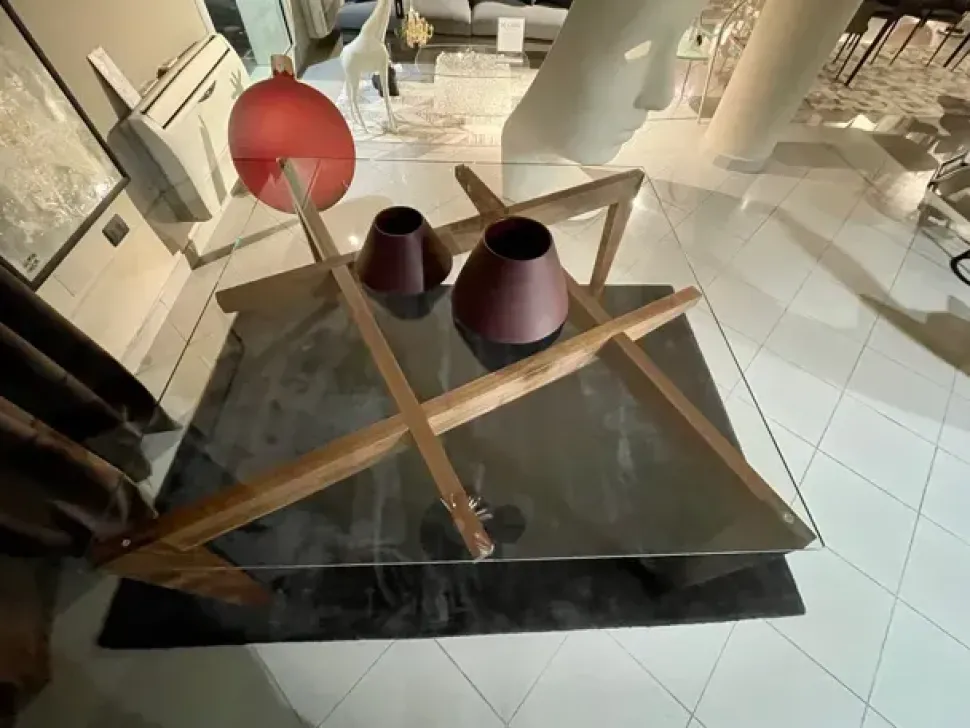 Le gambe di Autoreggente, all’apparenza esili, si appoggiano e si incastrano l una sull’altra. L equilibrio delle forze esprime movimento e instabilità ma l unione e la solidarietà dell intreccio generano forza e robustezza, e il tavolo si regge stabilmente da sé. Struttura noce canaletto e piano in cristallo 140x140x75.