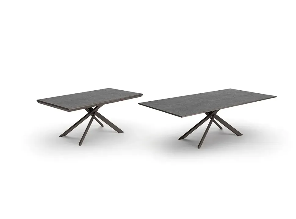 Il basamento incrociato è in metallo con piedini regolabili in altezza, piani e allunghe in legno, cemento o Marble Glass. Nella nuova finitura di piano Marble Glass piani e allunghe mantengono continuità nel disegno sia chiuso che aperto.