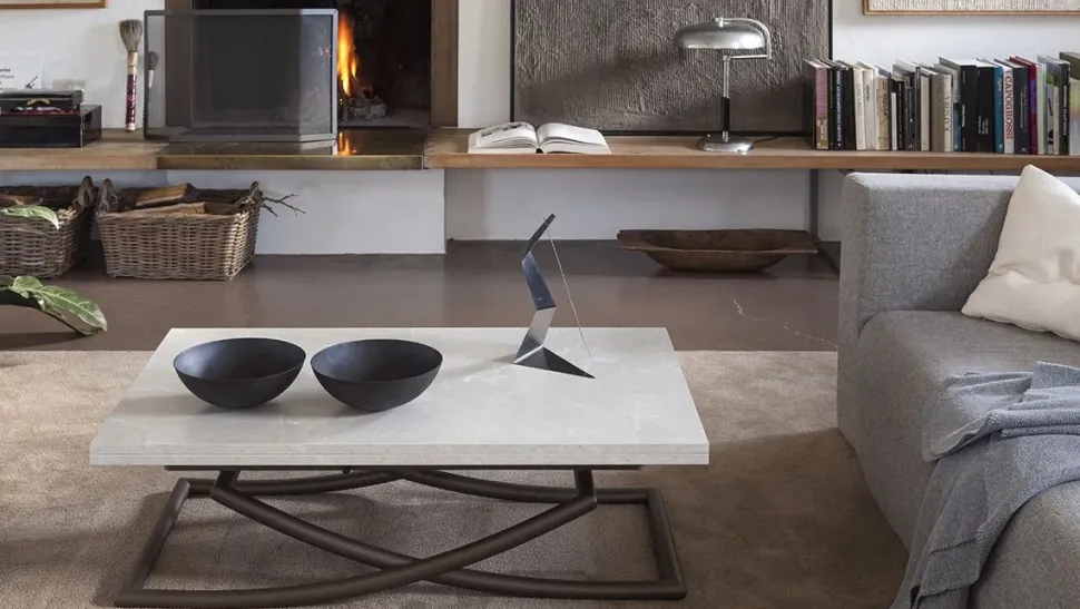 Tavolino trasformabile in tavolo da pranzo, base in metallo, meccanismo a gas, regolabile in altezza al millimetro da cm 35 a cm 75.