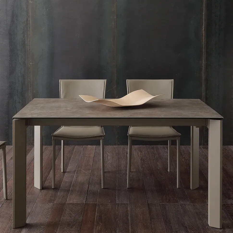 Ceramique è un tavolo con struttura verniciata in tinta e piano in vetro ceramica spesso 3+8 mm. L’allunga è a portafoglio, laccata goffrata in tinta con il piano. Ceramique è disponibile in 4 diverse versioni di colorazione con struttura in tinta: tortora fango, marmo bianco, grigio cemento, grafite brown e antracite.