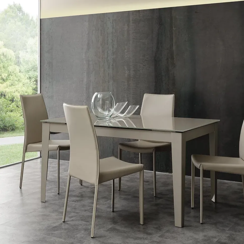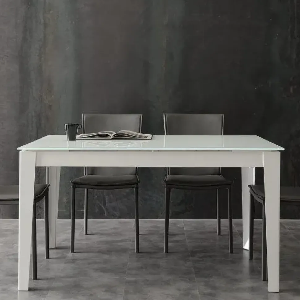 Il piano è in vetro temperato, ed è disponibile in due versioni: tortora chiaro lucido con struttura in tinta e extrawhite lucido con struttura bianca. La versione in promozione è con piano in tortora chiaro lucido e struttura in tinta. Per facilitare l’apertura e il montaggio del piano, i piedi del tavolo sono dotati di mini rotelle che permettono uno spostamento facile delle due estremità. Long Way è disponibile anche con piano in ceramica.