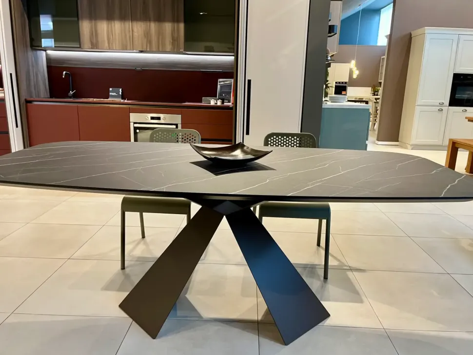 Una struttura a cavalletto ultima il valore estetico del tavolo Ellittico qui presente, che si confermerà in questo modo presenza caratterizzante del soggiorno o della zona cucina dove sarà collocato, grazie alla sua figura di grande personalità.