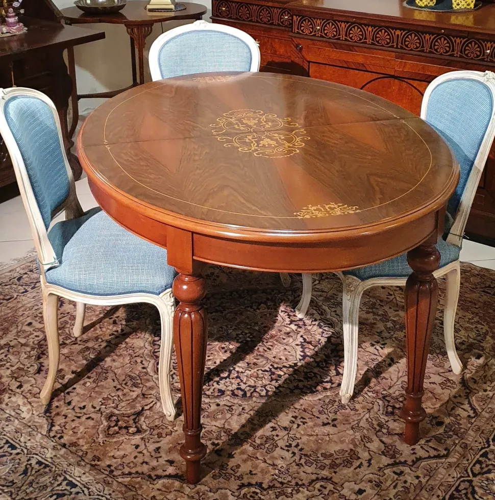 Prezioso tavolo artigianale in legno allungabile con gamba in massello tornita e piano con intarsio. Dimensioni 103 x 138 cm aperto 103 x 210 cm (2 allunghe). Tavolo nuovo realizzato in bottega brianzola in piuma di noce con 4 gambe tornite con lavorazione a bassorilievo. Le due allunghe, nascoste all’interno del tavolo, sono caratterizzate dalla stessa venatura del piano. Consegna esclusa da valutare a seconda del luogo di destinazione. Consegniamo in tutta Italia con trasportatore specializzato.