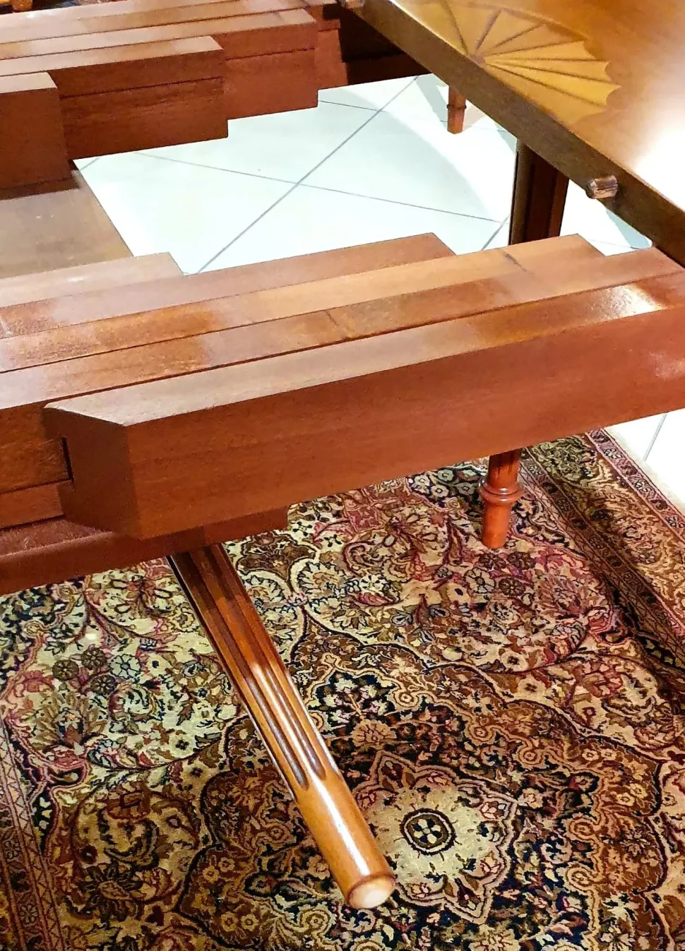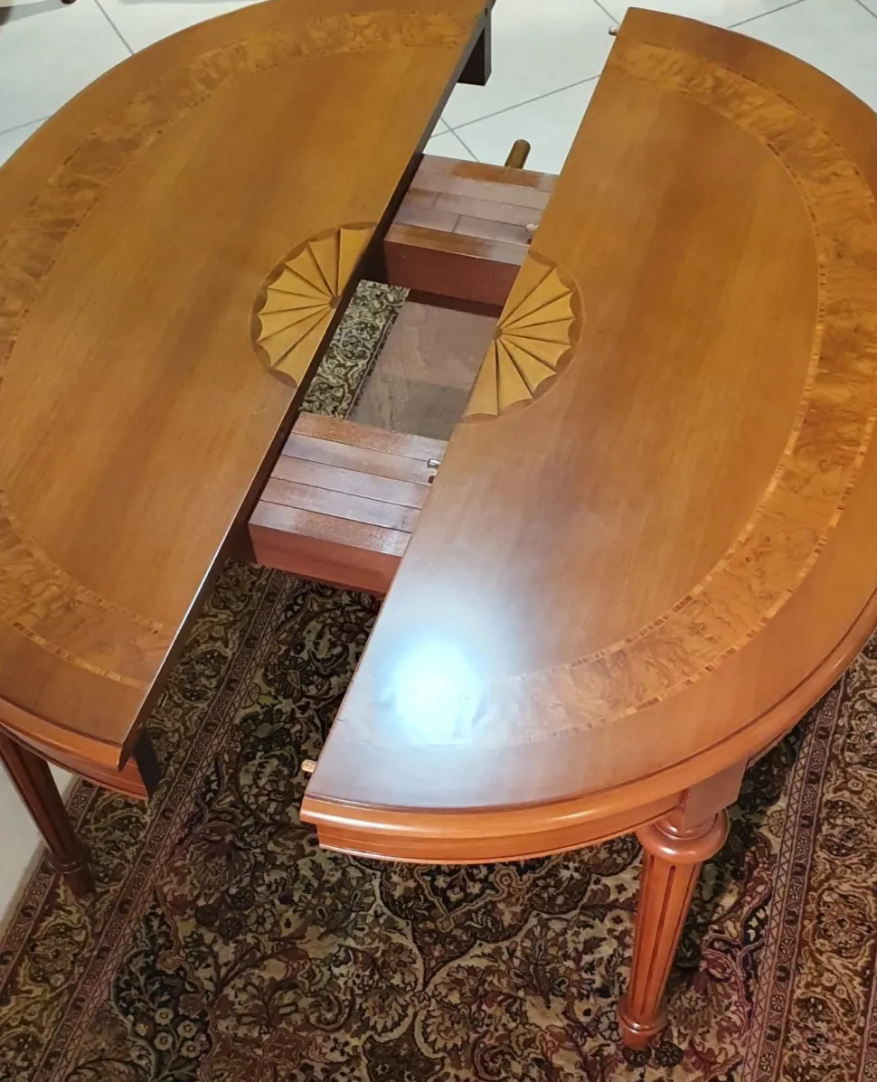 Tavolo artigianale in legno allungabile con gamba in massello tornita e piano con intarsio. Dimensioni 93 x 120 cm aperto 253 x 120 cm (4 allunghe). Tavolo nuovo realizzato in bottega brianzola in noce con fascia di intarsio in in radica e bois de rose, intarsio a ventaglio centrale e con 4 gambe tornite lavorate con bassorilievo. Apertura a scorrimento su binari in legno massello; potete scegliere quante allunghe aggiungere a seconda del numero di commensali, la gamba centrale di rinforzo si posiziona in automatico a seconda di quanto la volete aprire. Consegna esclusa da valutare a seconda del luogo di destinazione. Consegniamo in tutta Italia con trasportatore specializzato.