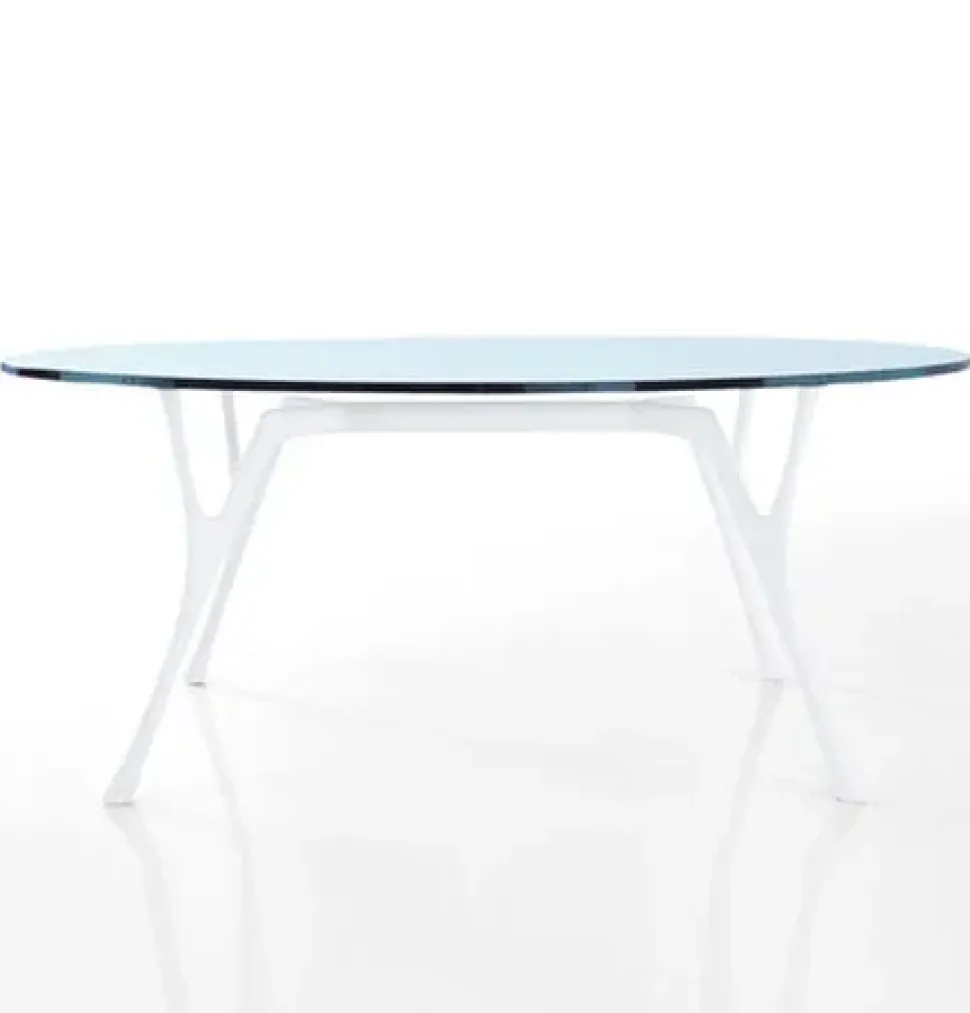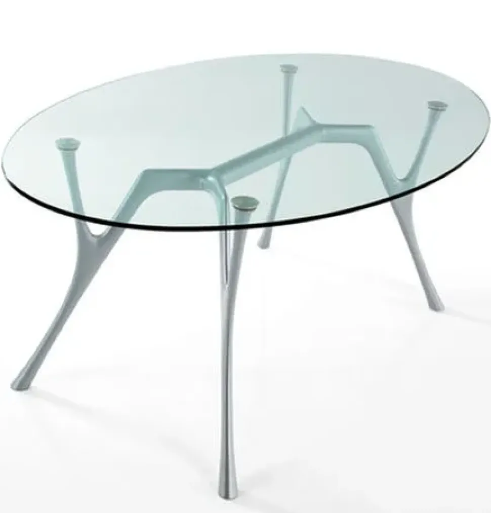 Tavolo ovale PEGASO con struttura in fusione di alluminio verniciato nero micaceo o bianco opaco. Piano ovale in vetro temperato e molato trasparente spessore 12 mm. Dimensioni L180 P110 H73 Su richiesta è disponibile in altre dimensioni e finiture.