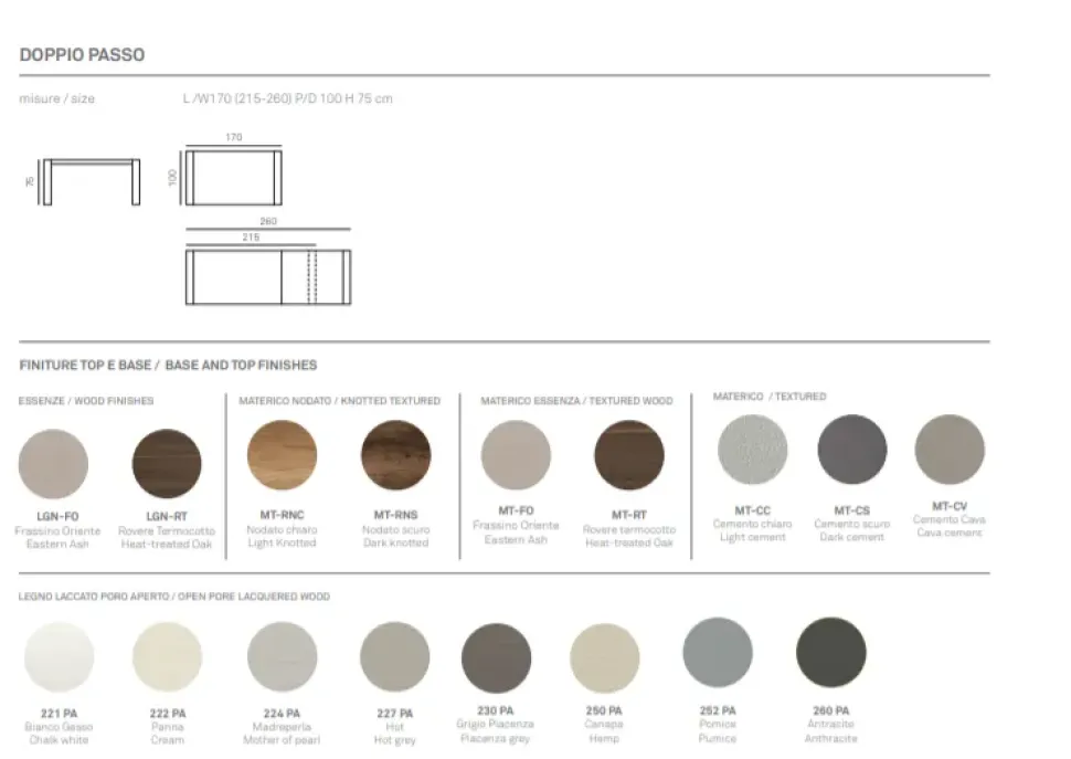 - Lunghezza da 161 a 190 cm: Il tavolo Doppio passo è disponibile in diverse lunghezze, da 161 a 190 cm. Questa varietà permette di scegliere la dimensione più adatta alle proprie esigenze e allo spazio disponibile.