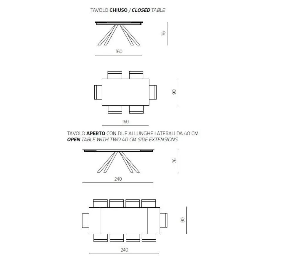 tavolo chiuso misura 90 x 160 cm allungato da entrambi i lati misura 240 cm