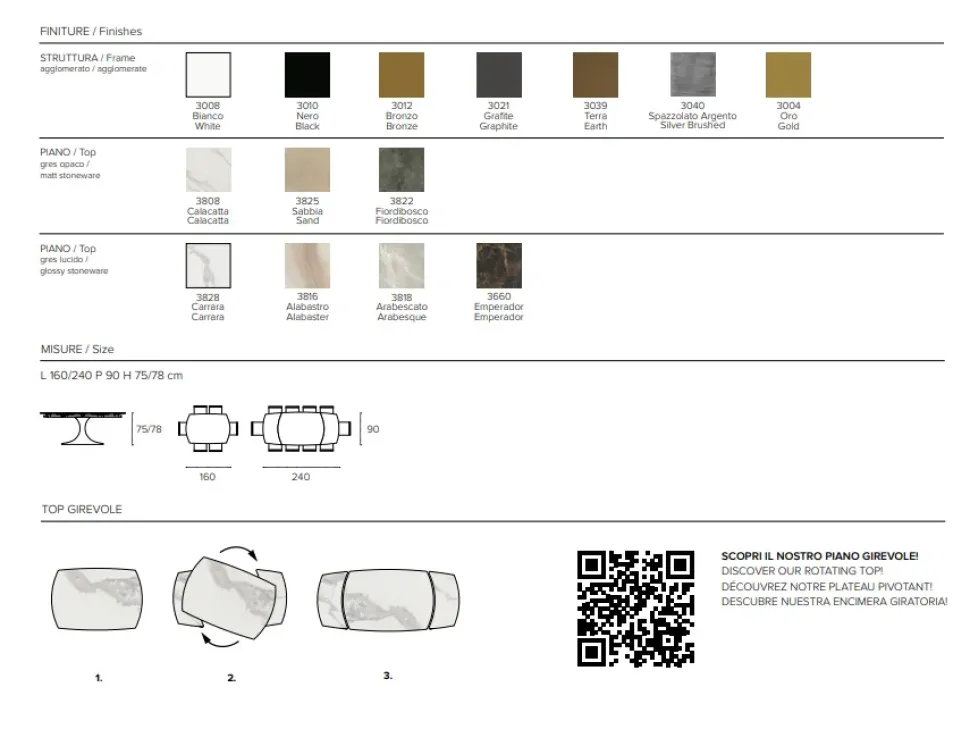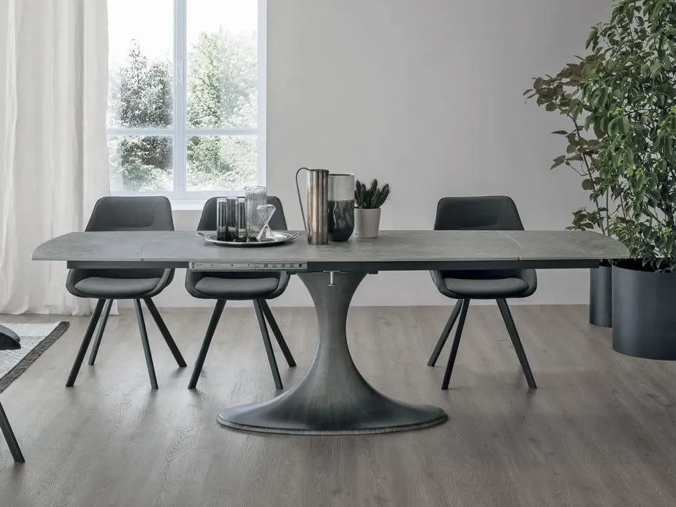 Tavolo allungabile con struttura in agglomerato e piano girevole a botticella in gres porcellanato.