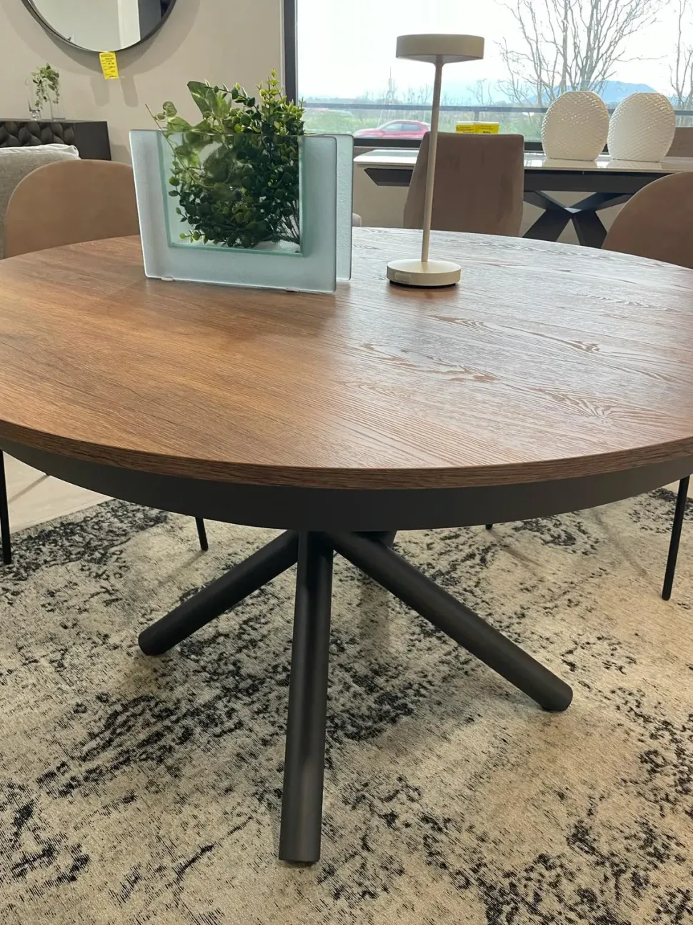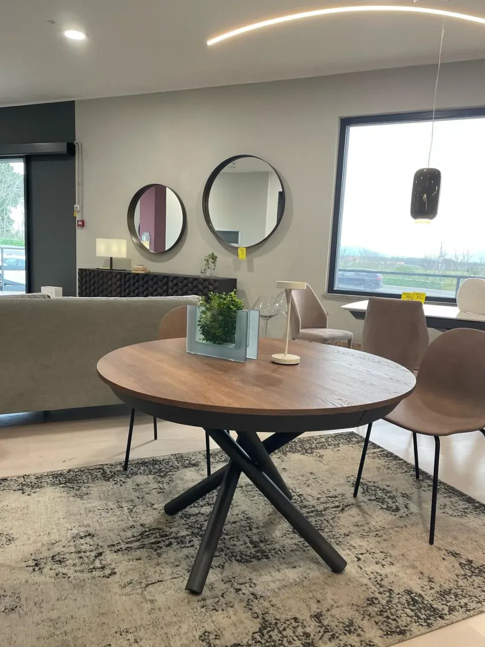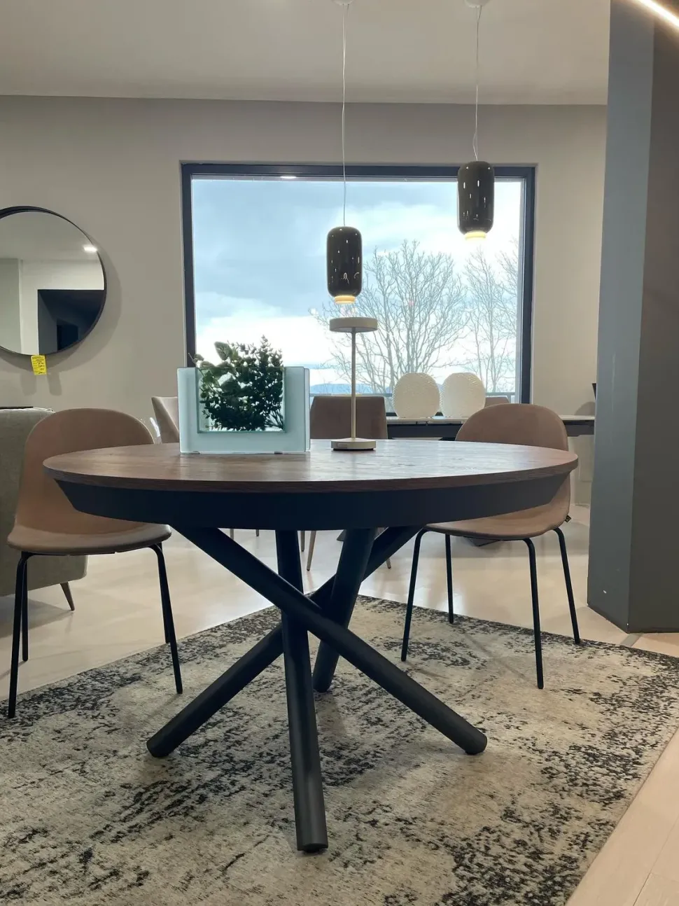 Tavolo rotondo con base in materico legno e gambe metalliche incrociate antracite, sistema allunghe interne a scomparsa