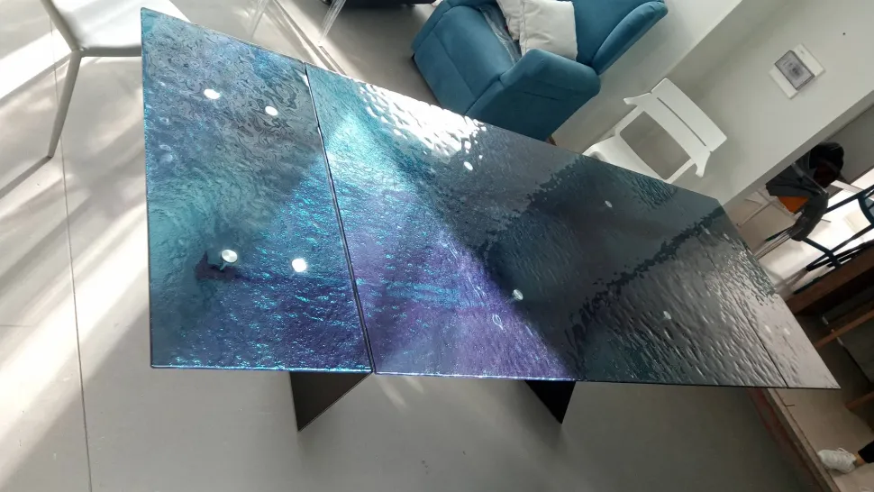 Il piano è in cristallo martellato blu oceano ed il basamento in metallo verniciato nero opaco
