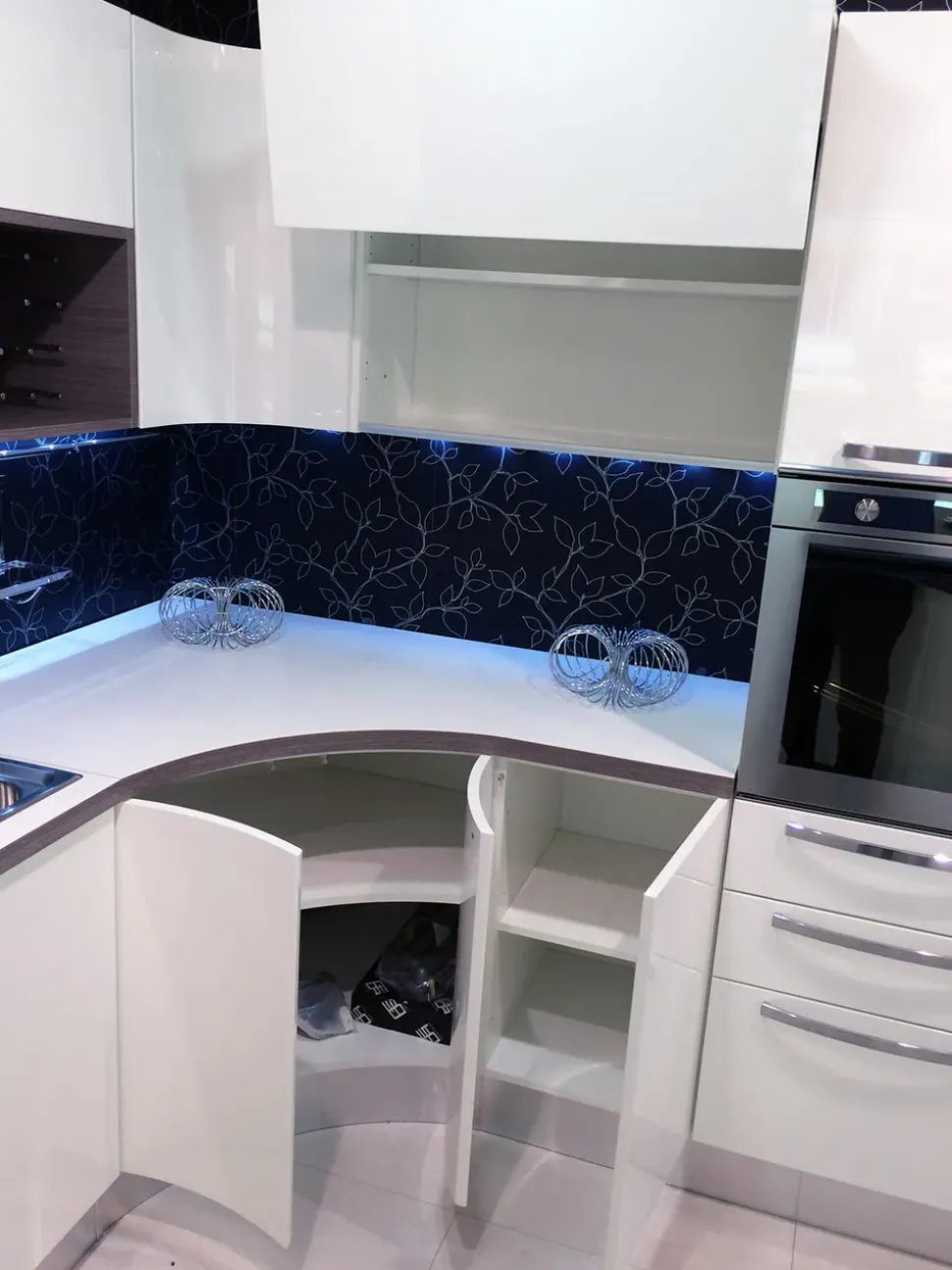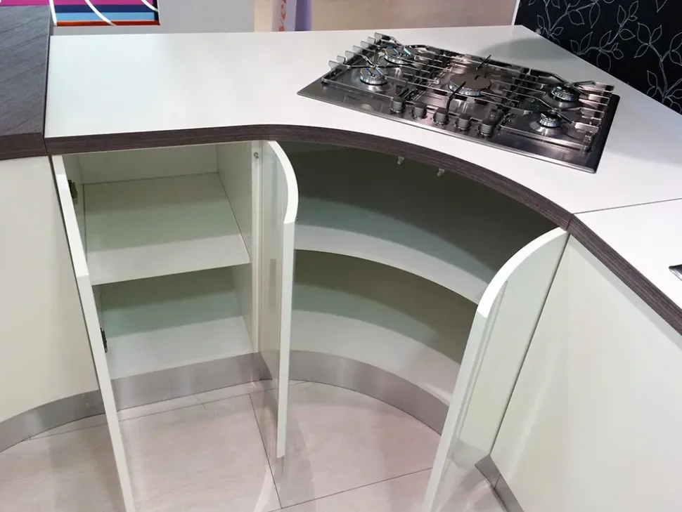 La cucina Extra tonda di Veneta Cucine è composta da una colonna terminale curva sinistra da cm 30, una colonna frigo destra da cm 60 con anta alta cm 127+72, una colonna forno destra da cm 60 con anta alta cm 67 con 2 cassetti e 1 cestone alto cm 36, una base destra da cm 45, una base angolo curva da cm 109×109 con 2 ante, una base lavello con 1 anta destra da cm 60, una base con 1 anta sinistra da cm 60, una base angolo curva da cm 109×109 con 2 ante, una base con 1 anta sinistra da cm 45, due bas1 con 1 anta curva sinistra da cm 92 e una base terminale curva con 1 anta sinistra da cm 30. La parte superiore della cucina Extra Tonda ha un pensile da cm 90 alto cm 72 e profondo cm 32 con apertura a soffietto, un pensile ad angolo curvo da cm 64×64 con un anta destra, un pensile da cm 45 con anta apertura vasistas alto cm 36, sotto un pensile a giorno portabottiglie in colore Dek alto cm 36 e lungo cm 45, uno scolapiatti con apertura a soffietto da cm 90, un pensile terminale curvo con 1 anta apertura sinistra da cm 30, la cucina è inoltre corredata da una barra porta oggetti con porta rotolo e da luce led sottopensile.