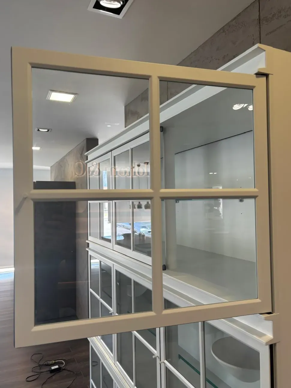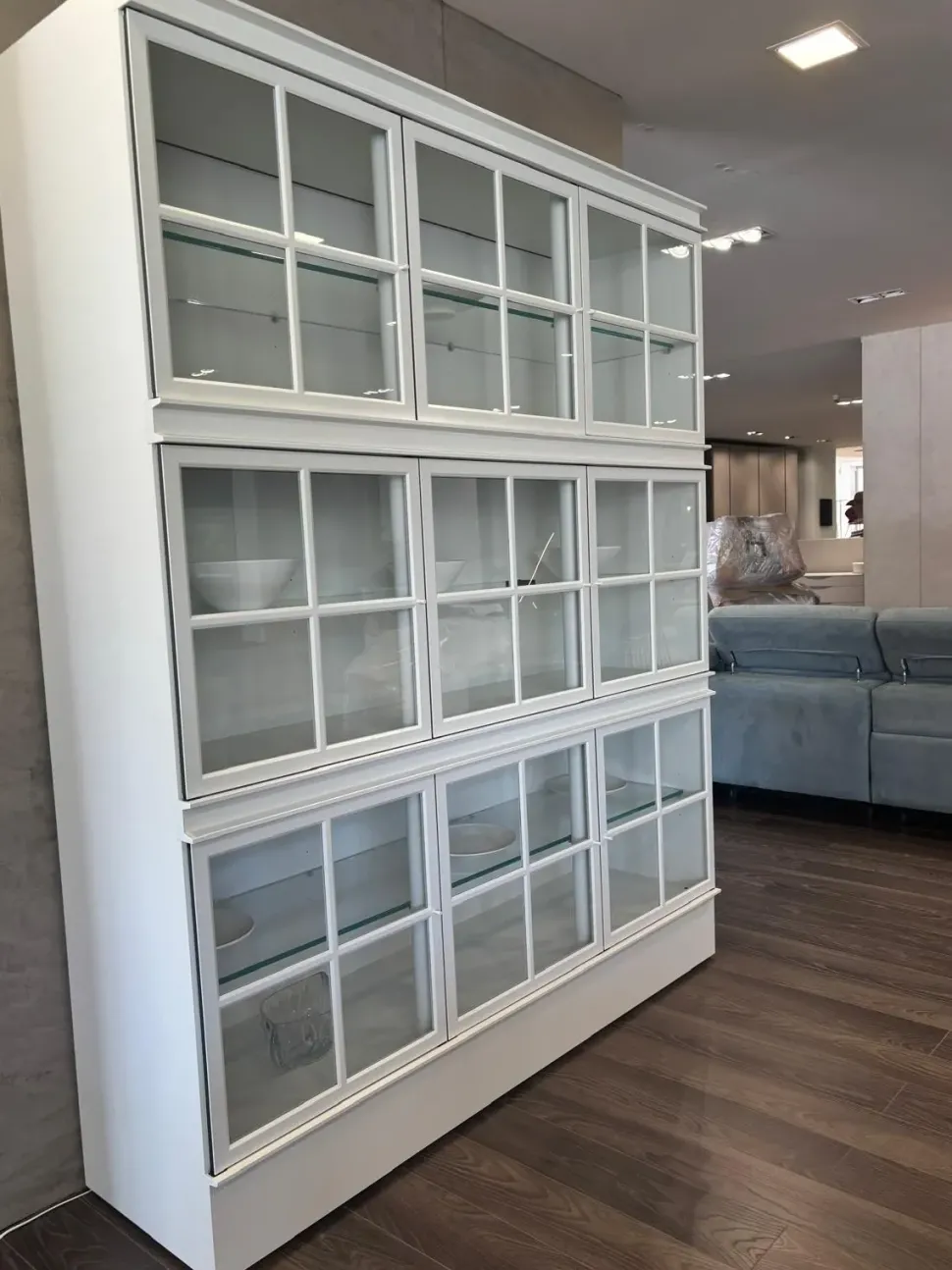 La versione in offerta è realizzata in laccato opaco bianco, con frontali raffinati e ripiani in vetro che permettono di esporre oggetti con leggerezza visiva. È prevista l’illuminazione interna a LED, per valorizzare i contenuti esposti.